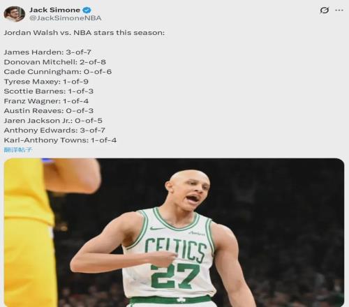 凯尔特人记者Jack Simone晒出一组数据,本赛季多名球星在乔丹-沃尔什防守下的表现:马克西9中1,坎宁安6中0,小贾伦-杰克逊5中0,奥斯汀-里夫斯3中0,米切尔8中2,爱德华兹和哈登都是7中3,小瓦格纳和唐斯都是4中1……